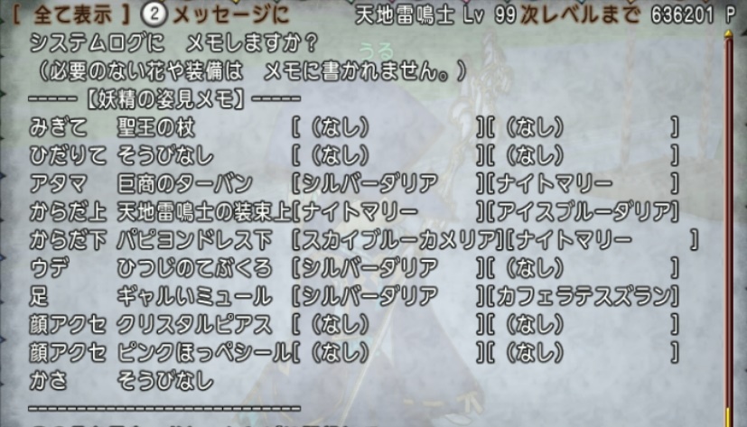 一応ドレスアップのメモを書いておきますので参考にしてくださいね。「ひつじのてぶくろ」はアンゴラモーア(神獣の森A-2)、「聖王の杖」は、ミスターガリック(白霜の流氷野F-6)の白箱で集めるのがお勧めです。