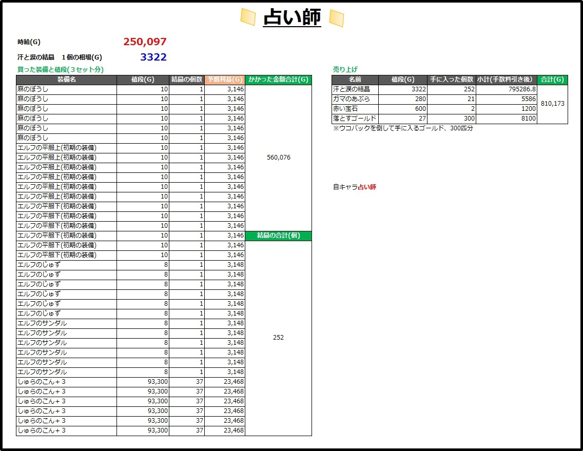 ※装備は、すべて錬金済みのものを買っています。結晶の値段や装備の値段、選び方により時給は変わってきます。